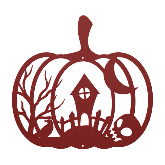 Halloween Pumpkin Metal Wall Art | Skull And Haunted House Scene